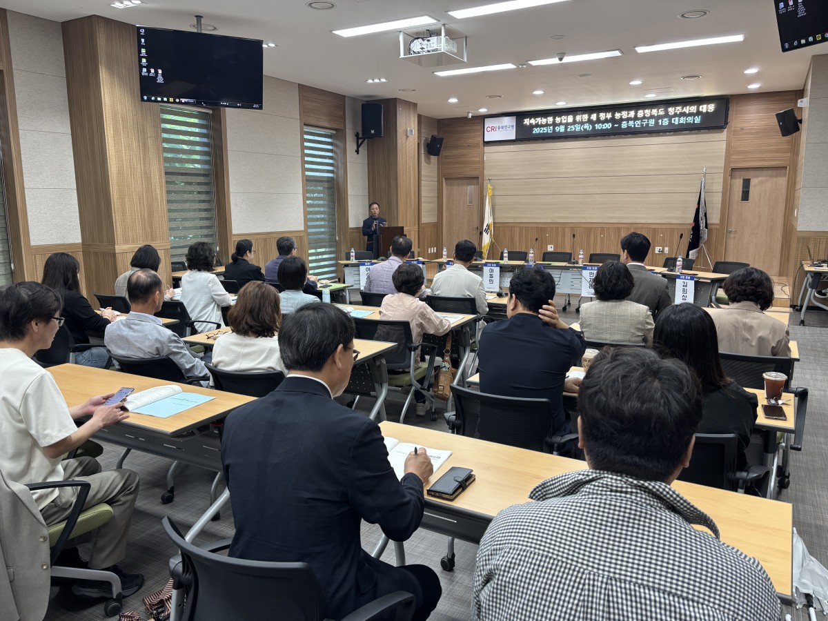 지난 9월 25일(목), 충북연구원 1층 대회의실에서 2025 지속가능발전 청주 포럼 "지속가능한 농업을 위한 새 정부 농정과 충청북도 청주시의 대응"이 개최되었습니다.