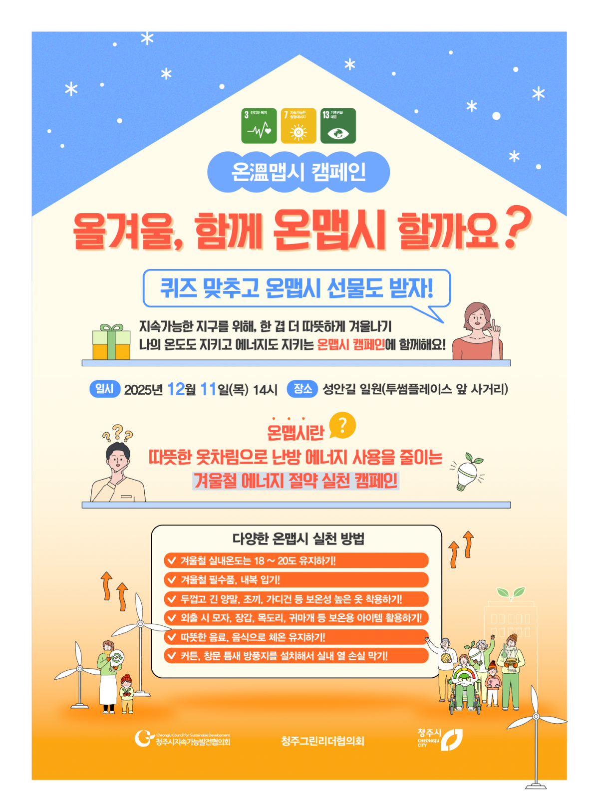 따뜻한 옷차림으로 난방 에너지 사용을 줄이는 겨울철 에너지 절약 실천 캠페인입니다.